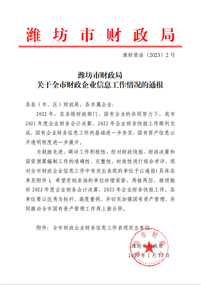 近日,濰坊市財政局下發(fā)文件,對全市財政企業(yè)信息工作情況進行通報,我公司榜上有名,連續(xù)兩年被評為“全市財政企業(yè)財務(wù)信息工作表現(xiàn)突出單位”。公司歷來高度重視財務(wù)管理工作。2022年度一把手親自抓靠,通過會計工作數(shù)字化轉(zhuǎn)型、人才隊伍結(jié)構(gòu)優(yōu)化、會計職能